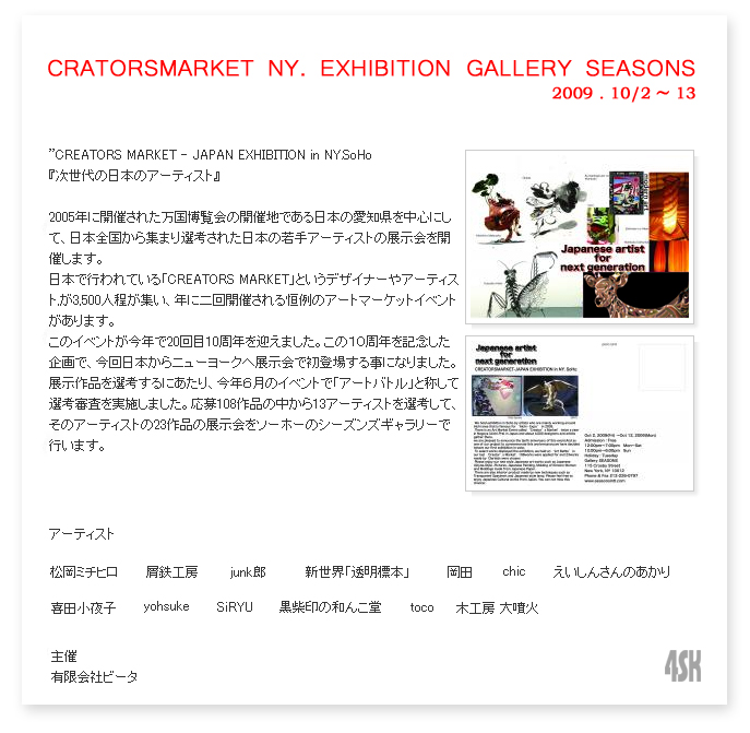 雨が降り続くこの頃です 10/2~13 までニューヨークのギャラリーさんで絵を展示してもらえることになりました。 6月のクリエイターズマーケットにて選考していただきました。 投票してくださった方、ありがとうございました とっても勇気づけられます 絵を作り始めた頃のことを考えると、 技術も考えもゼロというか~、、マイナスから始まって いろんな失敗をしながらコツコツ少しづつ学んできてます 技術、考え方、他、変わってきている自分もいる中で 魅力あるものを作っていきたいっていう気持ちは今も昔も変わってないです 変化していく部分もあるけれど、変わらない部分も大事にしていこう